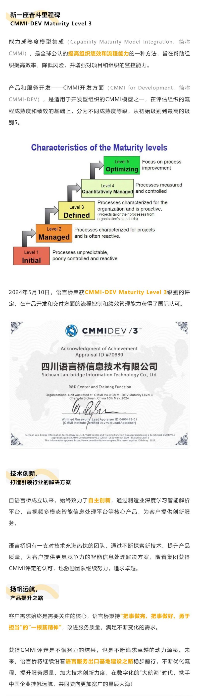 喜訊!語言橋榮獲CMMI-DEV Maturity Level 3級評定