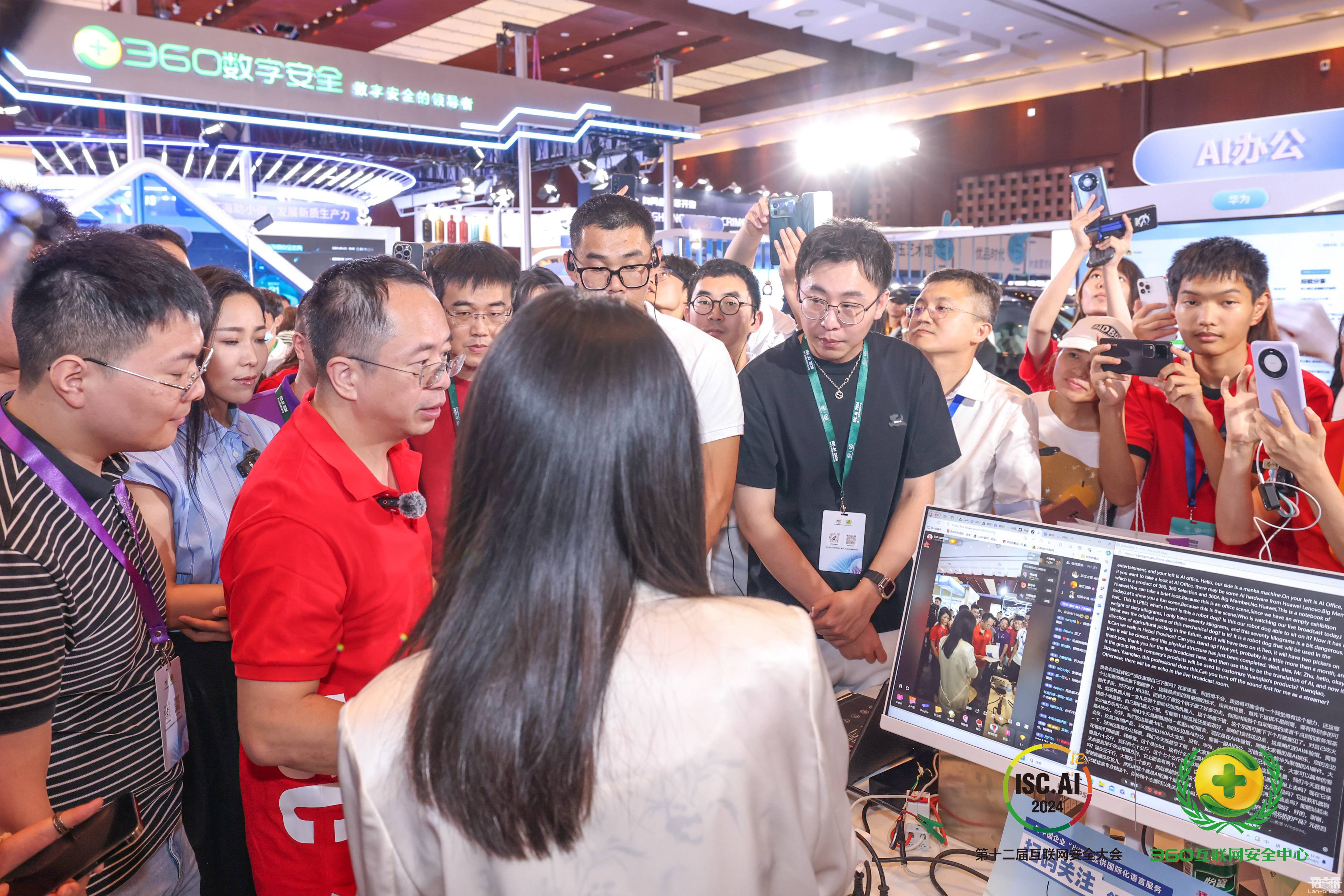 周鴻祎翻閱了語言橋集團 AI 翻譯平臺的介紹材料,并親自觀看了本次大會直播的 AI 英語同傳的翻譯效果。